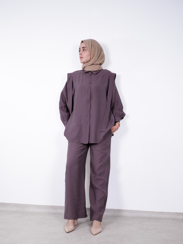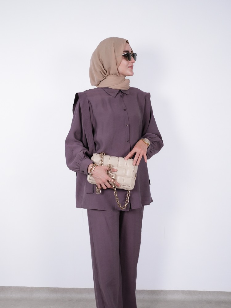 Lila Takım, zarif rengi ve rahat kesimiyle sade şıklığın en güzel halini sunuyor. Hafif ve dökümlü kumaşı sayesinde gün boyu hareket özgürlüğü sağlarken, omuz detayı modern bir siluet oluşturuyor. Bol paça pantolonu ve düğmesiz yakasıyla minimal detaylara sahip bu tasarım, hem şık hem de konforlu bir stil arayanlar için ideal. Şehir hayatının dinamik temposunda ya da ofis stilinizde rahatlıkla kullanabileceğiniz bu takım, stilinize ferah ve sofistike bir dokunuş katıyor.