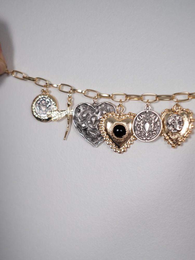 Kalpli Charm Bileklik, altın ve gümüş tonlarının bir araya geldiği zarif tasarımıyla öne çıkar. Üzerindeki farklı kalp motifleri ve sembolik detaylar sayesinde hem romantik hem güçlü bir stil sunar. Ayarlanabilir zinciriyle bileğe tam oturur, hafif yapısıyla gün boyu konfor sağlar. Gündelik kombinlerinize anlamlı ve dikkat çekici bir dokunuş katmak isteyenler için ideal bir parçadır.