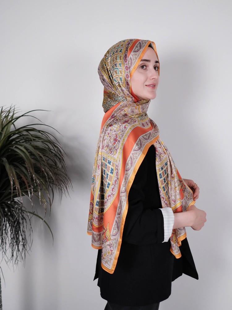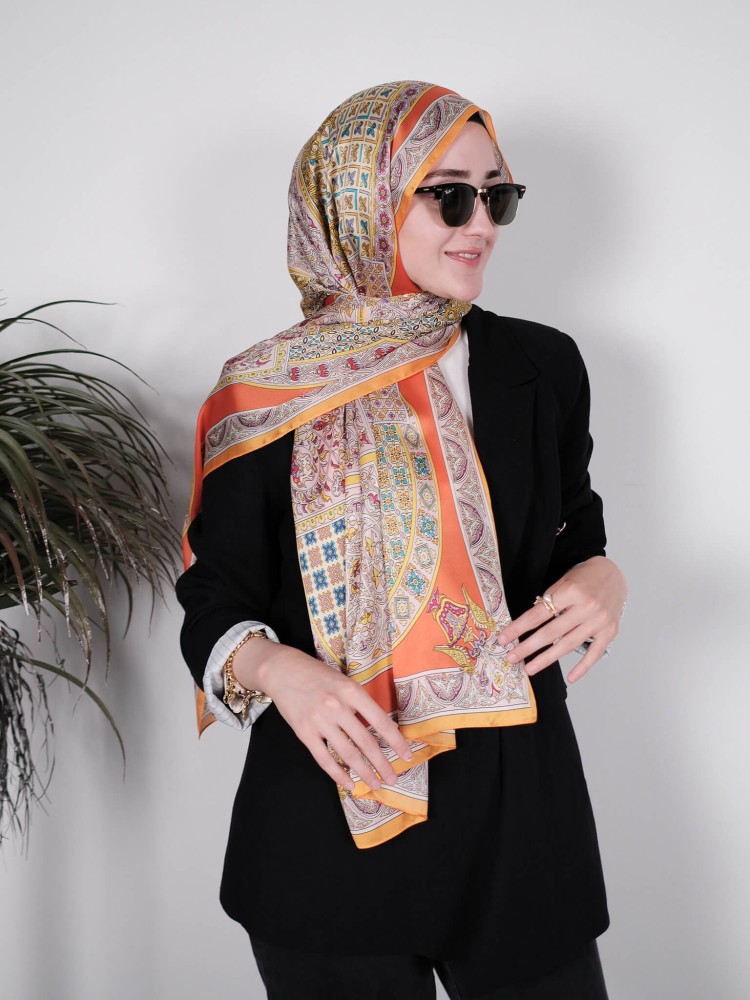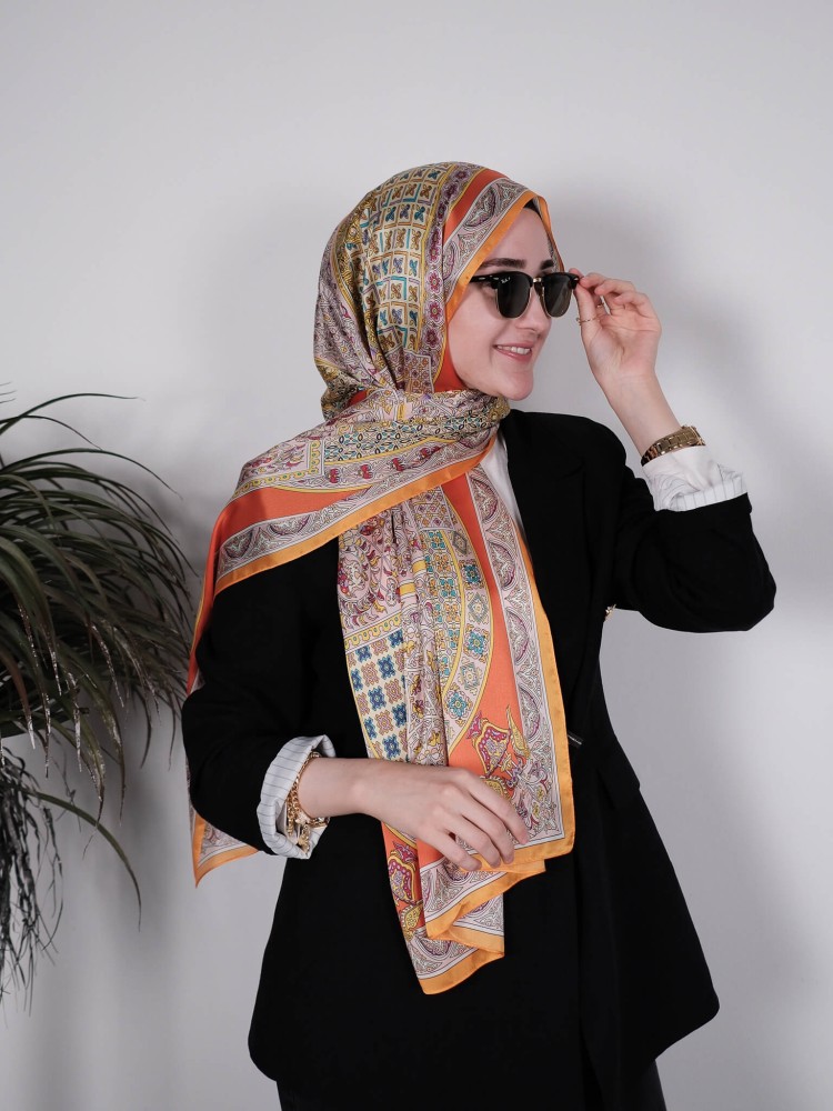 Canlı turuncu tonları ve geleneksel saray motifleriyle bezeli bu saten şal, sofistike ve zarif bir görünüm sunar. Parlak yüzeyi, ışığı yansıtarak kombininizi ön plana çıkarır. Desenlerin altın, mavi ve bordo detayları; hem klasik hem de modern stillere uyum sağlar. Yumuşak dokusu sayesinde kayma yapmaz ve gün boyu rahat kullanım sunar. Ofisten özel davetlere kadar her ortamda şıklığınızı tamamlar.